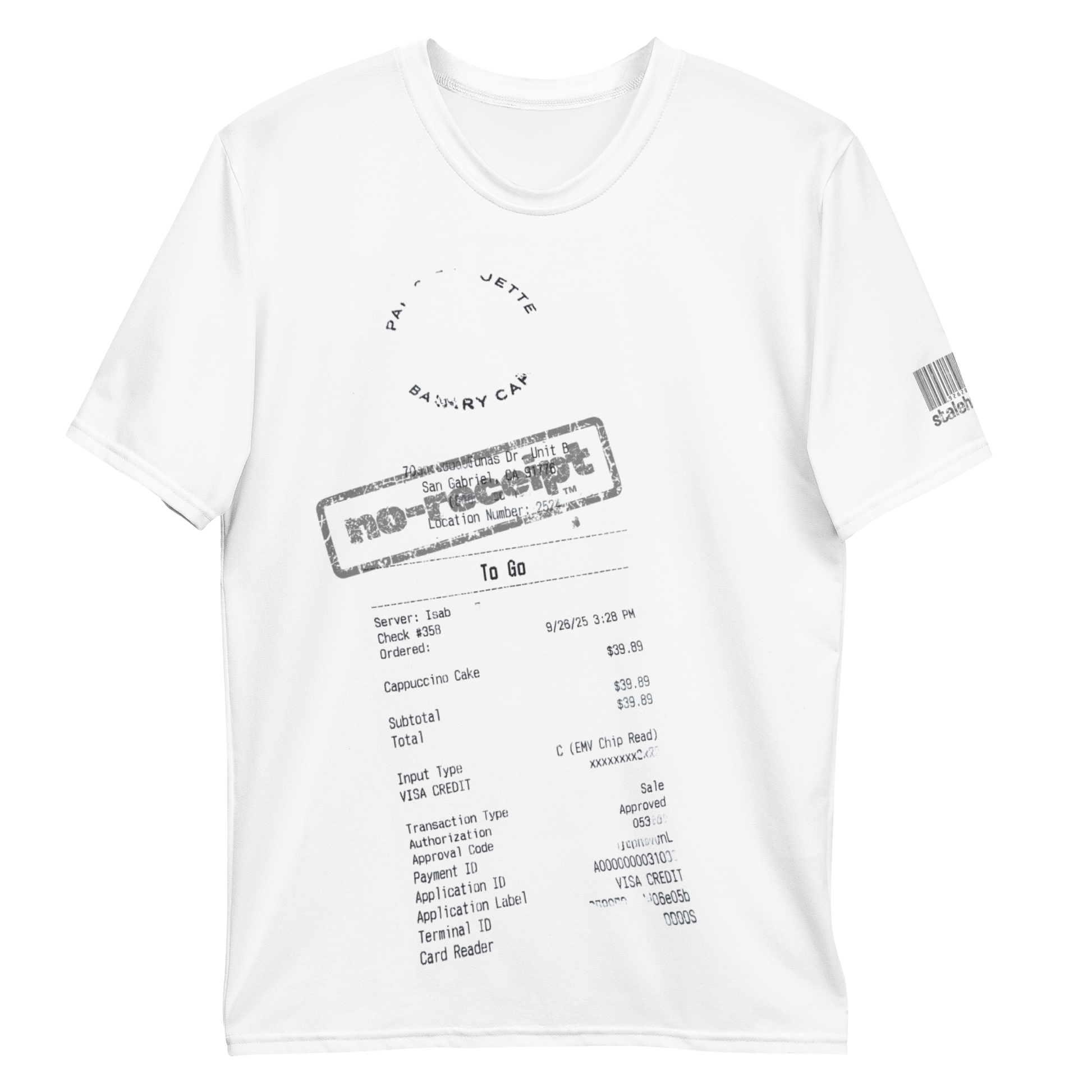stalehuman™ no-receipt men’s tee shirt • cappuccino cake print 00.1